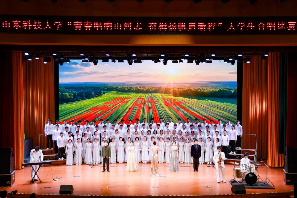 比赛现场氛围热烈,掌声与欢呼声此起彼伏。我院合唱团以别出心裁的情景剧拉开表演序幕,生动的情节迅速将观众带入情境。随后,悠扬的旋律响起,队员们深情演唱《明天会更好》,温柔的歌声中满含对美好未来的憧憬。一曲终了,一段饱含力量的朗诵自然过渡,将现场情绪推向新的高潮,紧接着《强国一代有我在》的激昂旋律奏响。队员们精神抖擞,歌声铿锵有力,充分展现出新时代青年的蓬勃朝气与坚定信念。表演过程中,器乐伴奏与舞蹈动作巧妙融合,与合唱声部完美配合,为整场演出增添了丰富的艺术层次。最后,全体成员齐声高呼 “出发”,声音洪亮激昂,成为整场表演的点睛之笔,赢得了评委与现场观众的一致认可与热烈掌声。
