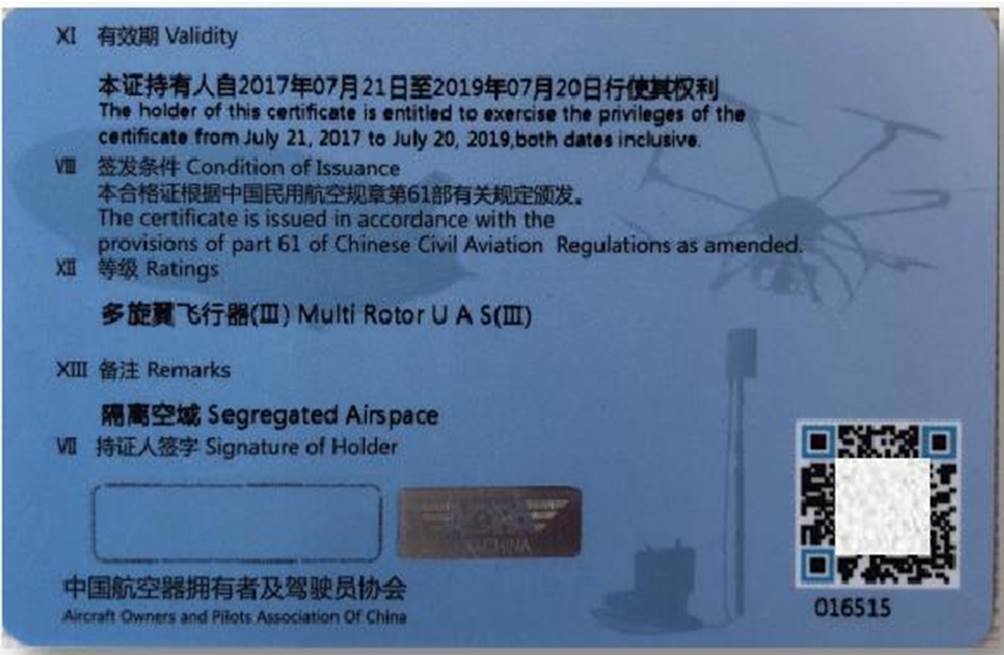 我校学员经理论和实践考试合格后,可以获得三个证书,分别是由中国民用航空局颁发的民航局“无人机驾驶员云执照”,由中国航空器拥有者及驾驶员协会(AOPA)颁发的“AOPA无人机驾驶员合格证”,和由永利官网颁发的永利官网无人机测绘结业证书。其中民航无人机驾驶员执照和AOPA无人机驾驶员合格证等级高,含金量大,“一考双证”是我们睿飞无人机培训学校的巨大优势。